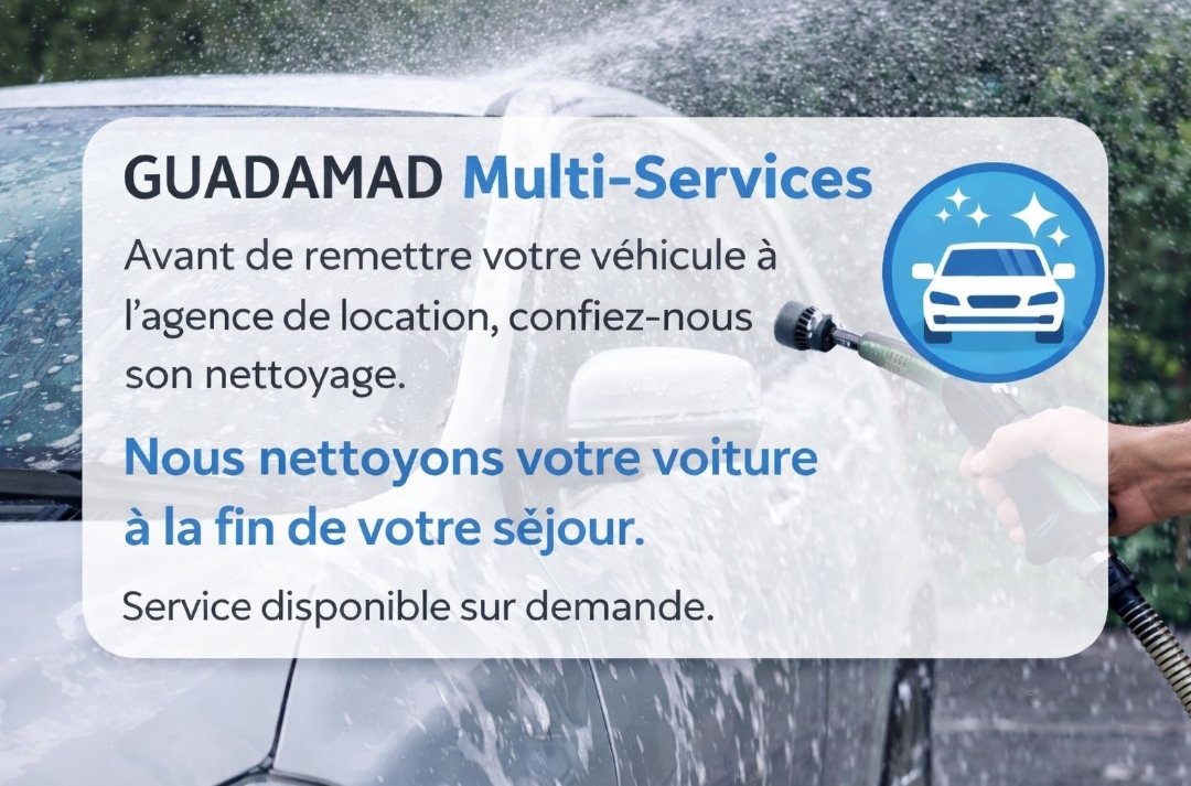 Pour faciliter votre départ, Guadamad Multi-Services propose un service de lavage de véhicule. Cela permet de remettre votre véhicule propre à l’agence de location avant votre retour, sans perdre de temps à chercher une station de lavage. ( Prévoir 2h00 minimum selon état ) Uniquement sur rendez-vous.